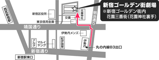 どうしても道が分からないときは、03-5272-3537(新宿ゴールデン街劇場)までご連絡下さい。