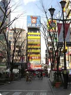 『カラオケ館』『SHiDAX』などのビルを左手に眺めながら、横断歩道まで直進します。