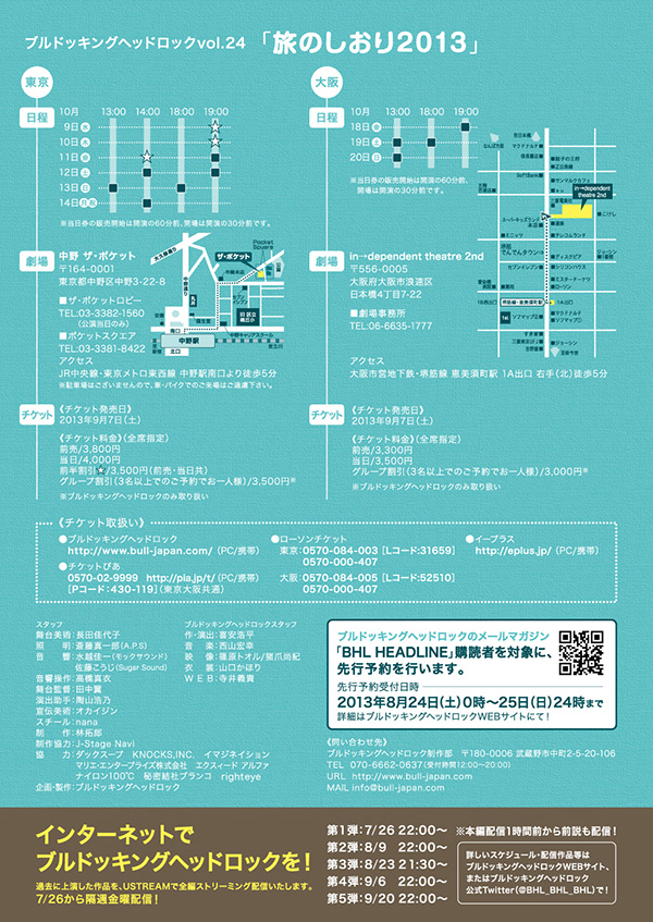 今回、ブルドッキングヘッドロックが初めて大阪へ行く。いわゆる “旅公演” だ。…大丈夫なのだろうか?行く本人ですが。どうしてここまで来ちゃったんだろう、と、見知らぬ土地でぼんやり膝を抱えるのかもしれない。意外とノリノリで、名所を見て回っちゃうのかもしれない。いずれにしてもついに私も旅に出る。